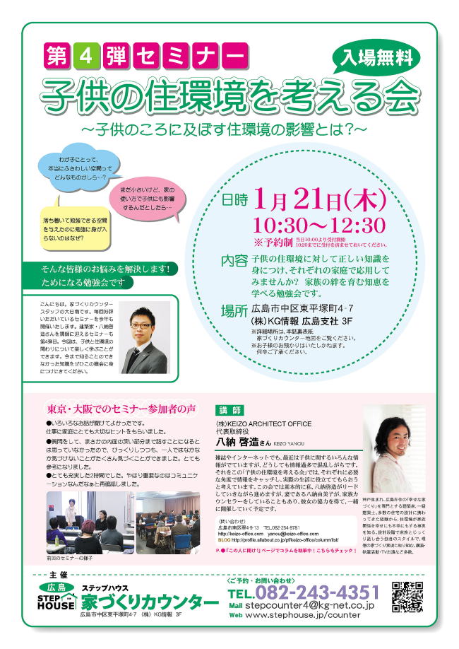 自分の子ども時代を考えてもまさにそのとおり!という内容もあり、苦笑してしまったりもしました。大人になった今からでも住環境・職場環境を改善しよりこうありたいという自分・人生に変えていくことは出来るという実感ができました。家を建てるのはまだまだ先ですが、セミナーを受けて明日から人生が変わりそうです。