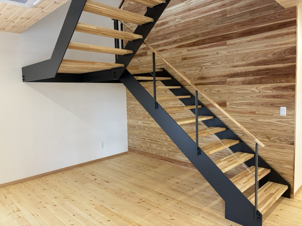 階段の側面壁には外壁と同じ杉を使用した板貼りとしています。それに合わせて鉄骨階段の塗装を黒にしたので、とてもかっこよく仕上がりました。