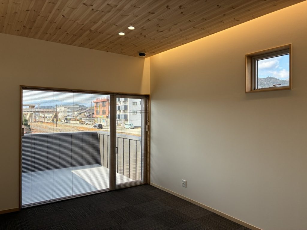 社長室です。床の黒いタイルカーペットと天井の板貼りによりかっこいい仕上がりになりました。バルコニーに観葉植物を置けばとてもいい感じのお部屋になりそうです。