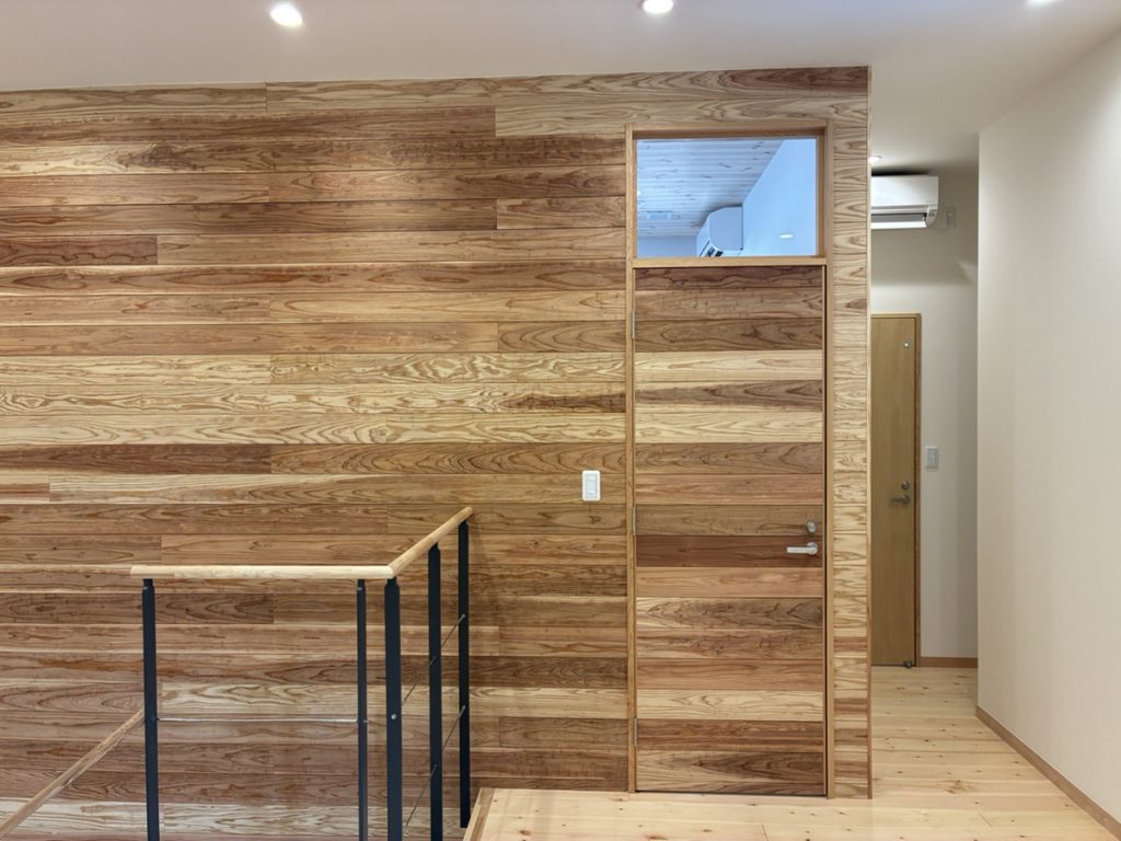 社長室の入り口戸です。扉にも壁と同じ杉板を貼っています。