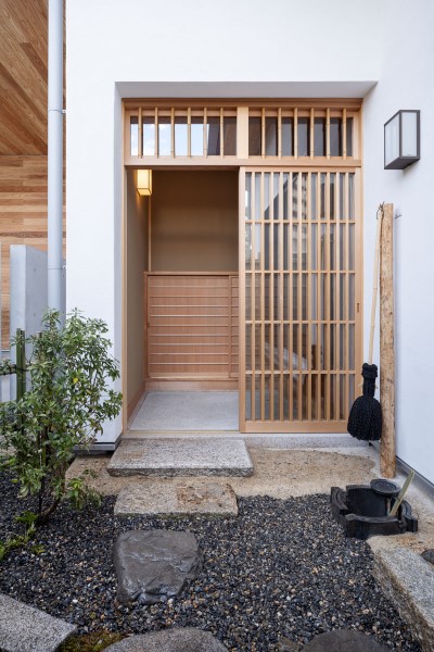 茶室側の塀は中の様子が伺えるように木製の横格子の柵としました。