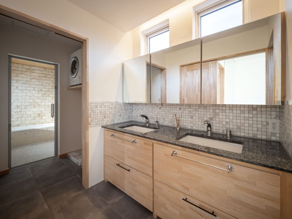 洗面脱衣室は床はタイル、洗面台の天板は石のカウンターとなっています。
