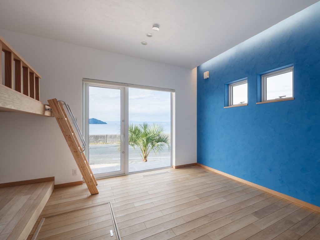 また、壁一面はアクセントとして、南国をモチーフとした青色のイタリアンスタッコを採用しました。